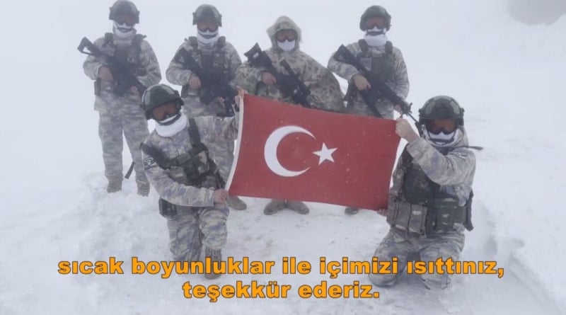 Paylaşımda, "Ankaralı Hatice Güner Hanımefendi'nin sevgiyle ördüğü, her ilmeğinde vatan sevgisi barındıran 195 adet el emeği boyunluk, zorlu kış şartlarında görev yapan kahramanlarımıza ulaştı.