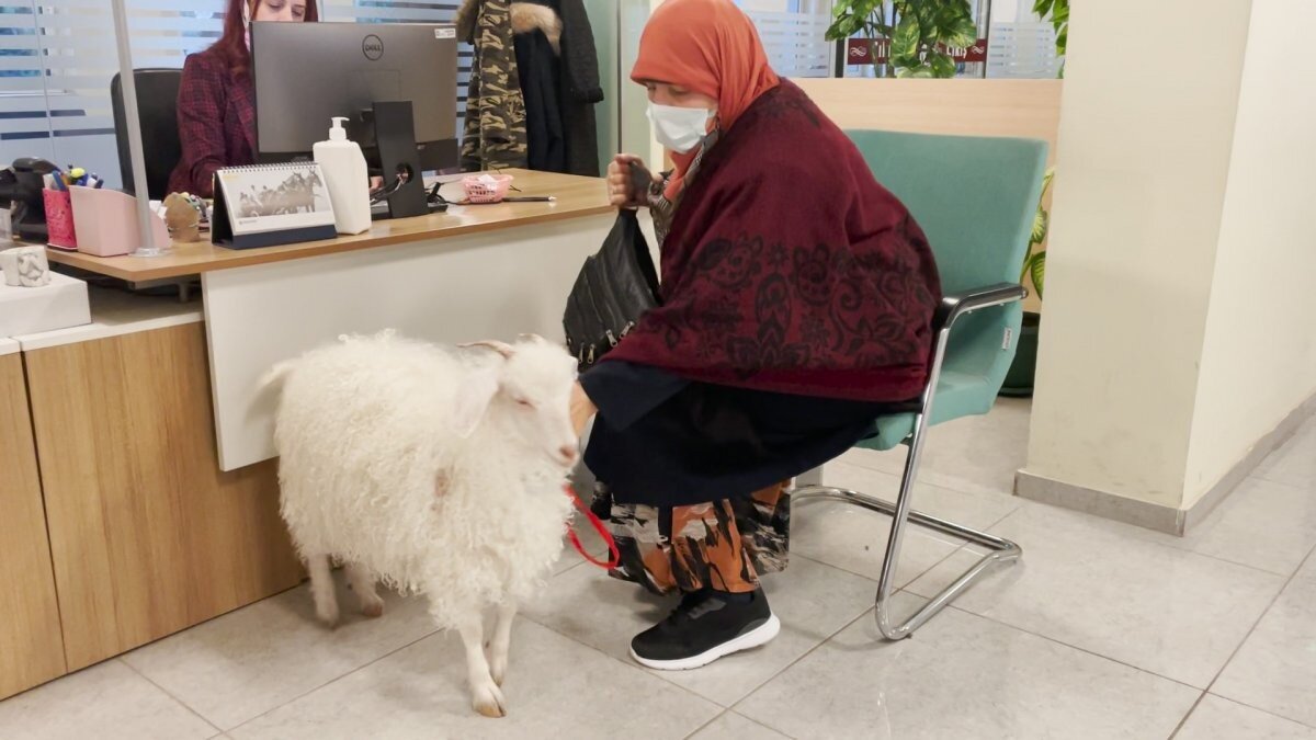 Elif Sapmaz, keçisi Pamuk ile yaptığı sabah yürüyüşünün ardından vergi borcunu yatırmak için Sincan Belediyesi'ne gitti. Sapmaz oturduğu sandalyede işlemlerin tamamlanmasını beklerken, sevimli keçisi de yanı başında meraklı gözlerle etrafı inceledi.