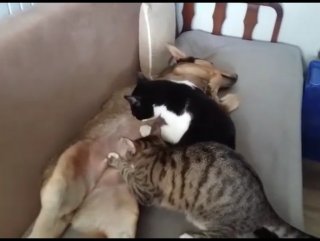 Sosis adlı anne köpek, yavru iken öksüz kalan kedilere annelik yapıyor.