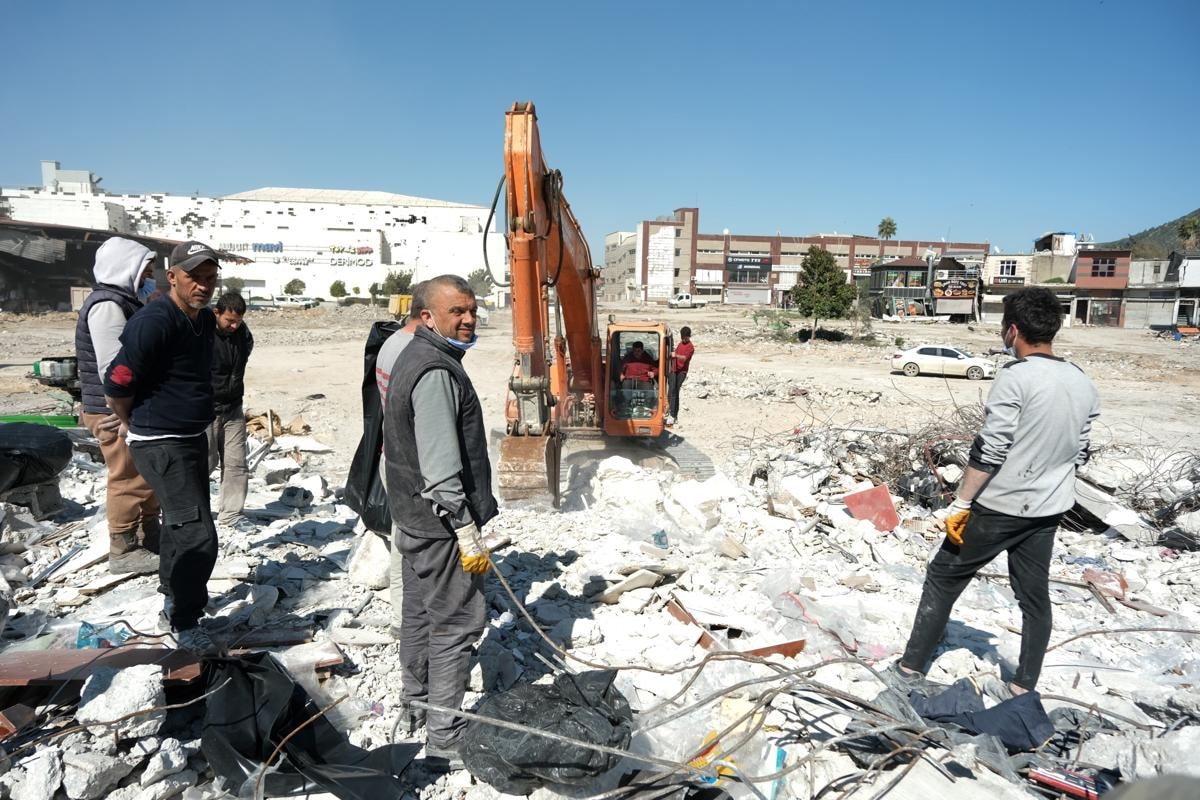 Bölgede enkaz kaldırma çalışmaları başlarken, Umut Tatlı da kiraladığı bir iş makinesiyle yıkıntılarının arasından sağlam kalan ürünlerini kurtarmaya çalışıyor.
