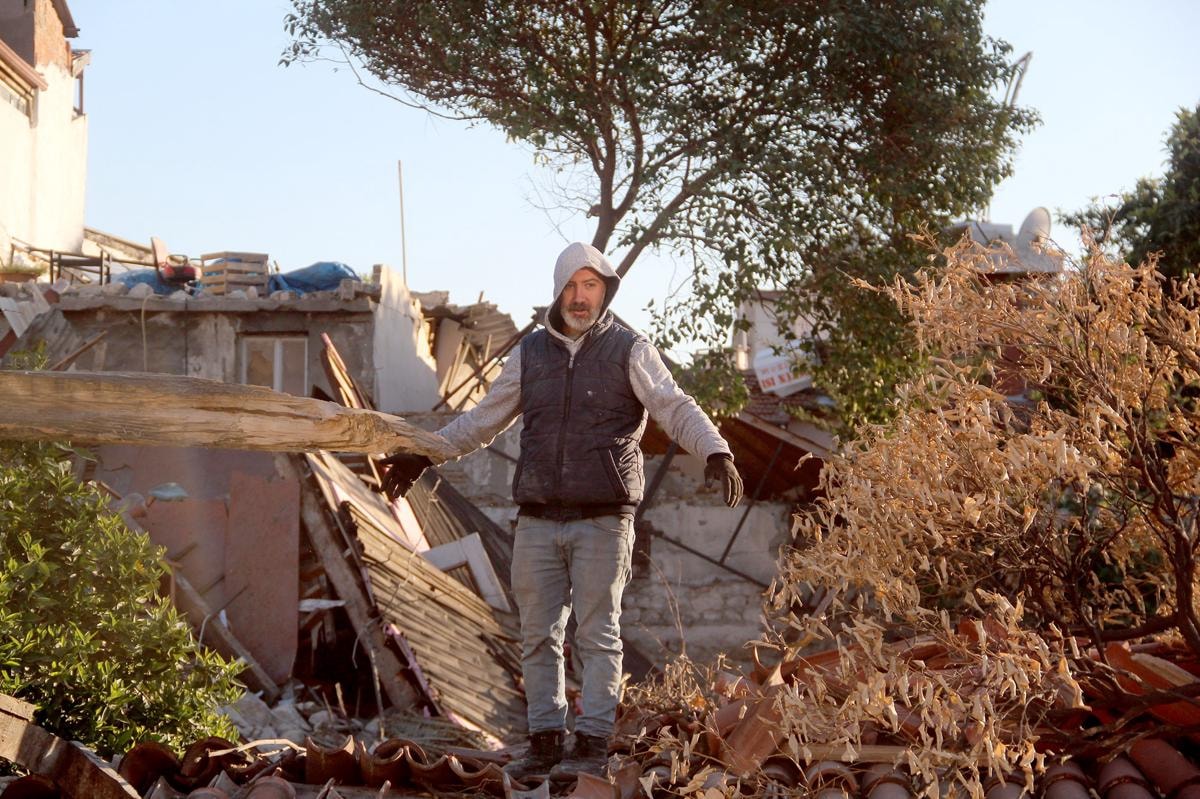 Çöken yapıların çatısından evine ulaşan Parıldar, tehlikeye rağmen birkaç parça eşyasını kurtarmak için çaba sarf ediyor.