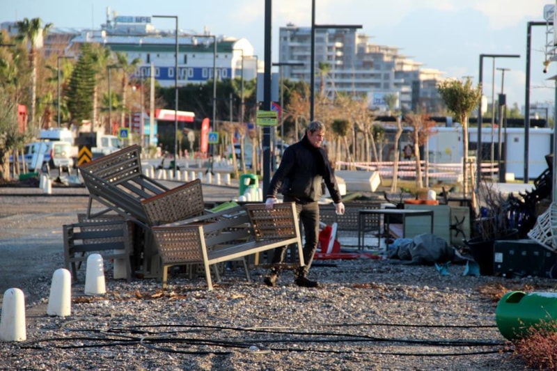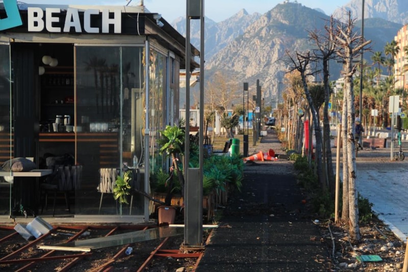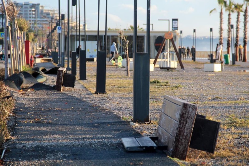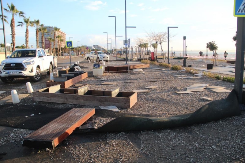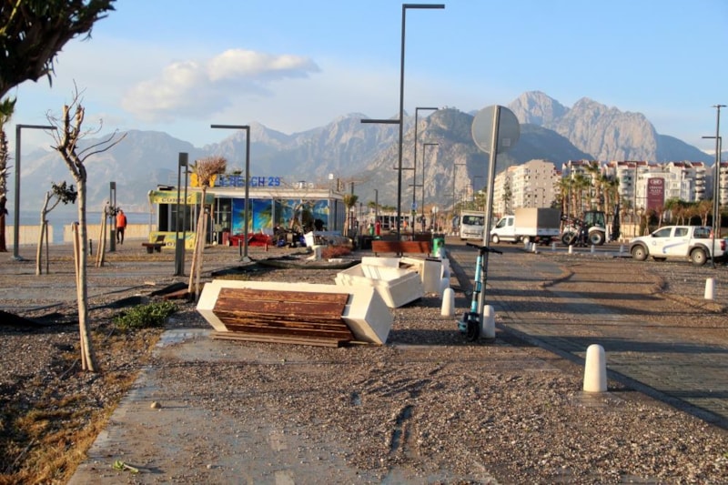 Meteoroloji'nin 'turuncu' kodla uyardığı kentte, sahildeki işletmeler fırtınadan olumsuz etkilendi. Beton banklar, oturma grupları, spor aletleri yerinden söküldüğü görüldü.