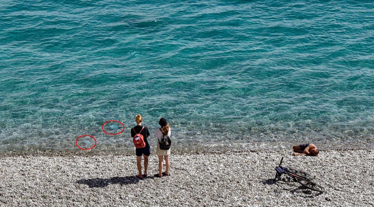 Sahilde vakit geçirenler ise dalgaların kıyıya vurduğu alandaki denizanalarını izlemeyi tercih etti. Bazıları denize girmek yerine sahilde güneşlendi.