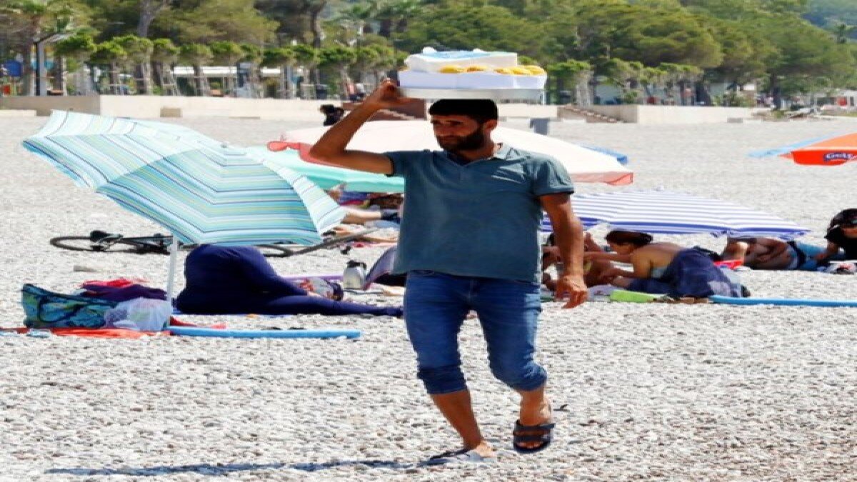 Vatandaşlar sahile serinlemek için gelirken, satıcılar ise 40 dereceyi bulan sıcak havaya rağmen sahilde kilometrelerce yürüyerek, ekmek parasını kazanmaya çalışıyor.