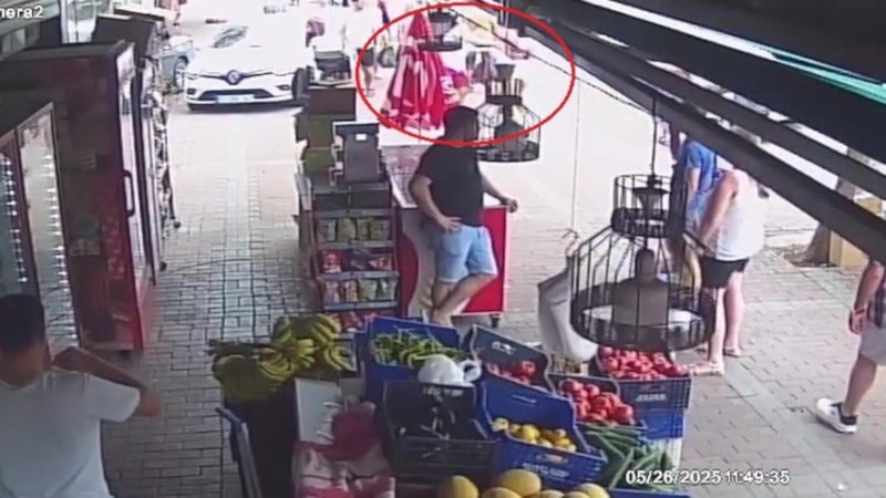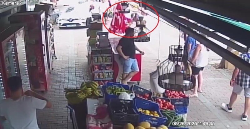 Manavgat'ta, semt pazarında alışveriş yapan Alman turist, Türk bayrağı almak istediği şahsın kapkaçına uğrarken kovalama anları kameralara yansıdı.
