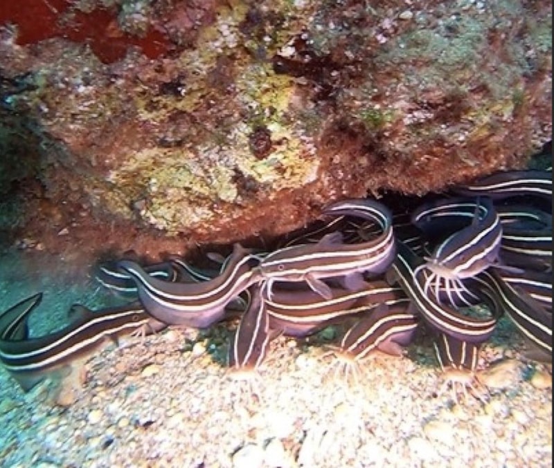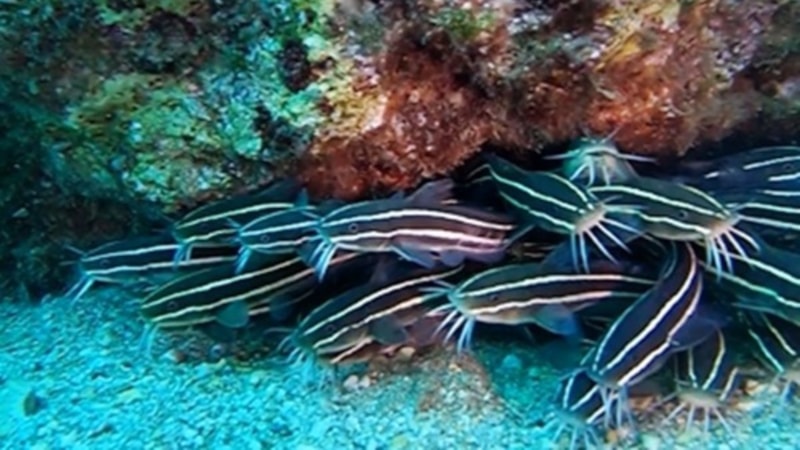 Yaklaşık 30 yıldır dalış eğitmenliği yapan Kürşat Bilgin, daha önce Antalya Körfezi sularında hiç rastlanmamış zehirli dikenleri olan çizgili kedi balığı (Plotosus lineatus) sürüsü ile karşılaştı.