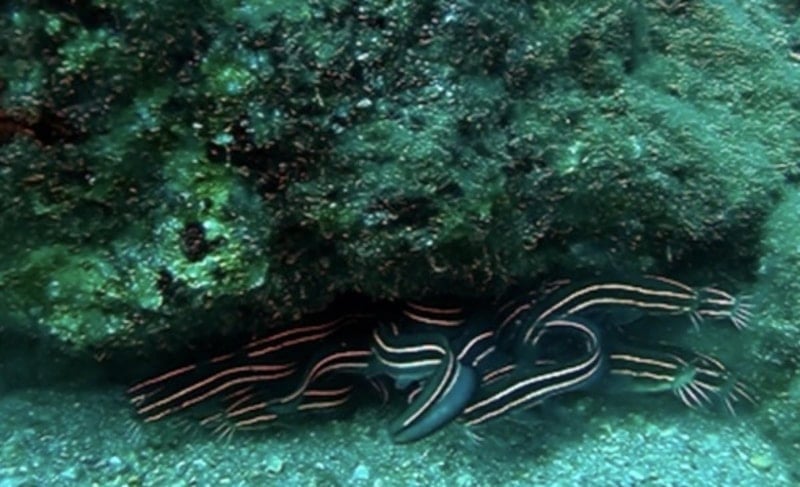 Bilgin, yaklaşık 13 metre derinlikteki bir taşın altında, sürü halinde yaşayan bu balıkların görüntülerini sualtı kamerasıyla kaydetti.