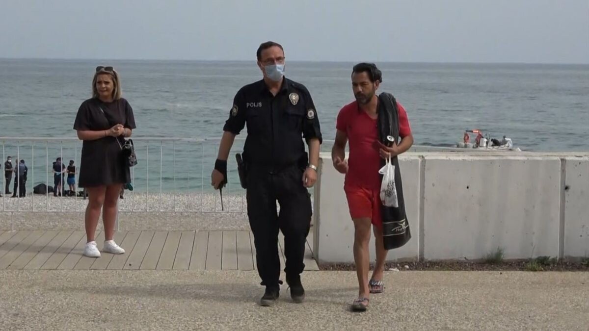 Antalya Konyaaltı sahilinde sokağa çıkma kısıtlaması ve maske denetimi yapan polis ekipleri, bulvarda havlusu ve plaj şortu ile yürüyen Umut A.’dan muafiyet belgesini göstermesini istedi.