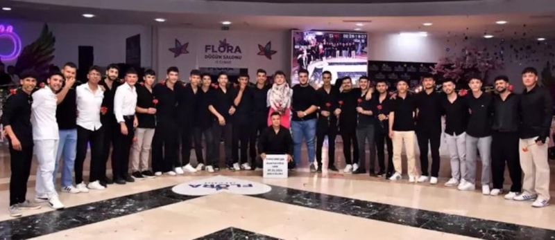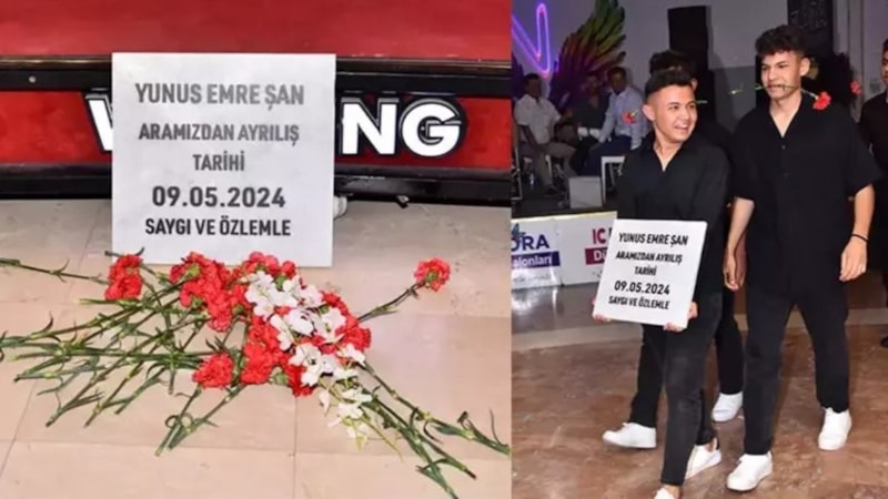Damadın arkadaşları, çift fotoğraf çektirmek için beklediği sırada ellerinde üzerinde 'Yunus Emre Şan, aramızdan ayrılış tarihi, saygı ve özlemle' yazılı mezar taşı ile salona girdi. Siyah kıyafetler ve karanfillerle salona giren arkadaş grubunu gören çift ve davetliler, şaşkınlıklarını gizleyemedi.