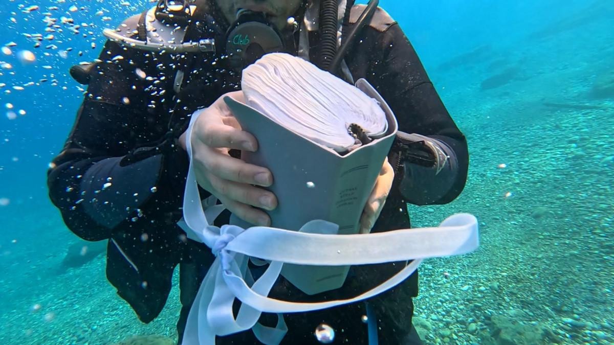 Karşılaştıkları bu nesneleri su altından çıkaran ekip, son olarak geçen hafta sonu Konyaaltı Sahili'nde yaptıkları dalış sırasında deniz dibinde kurdeleyle bağlanmış bir kitap gördü.