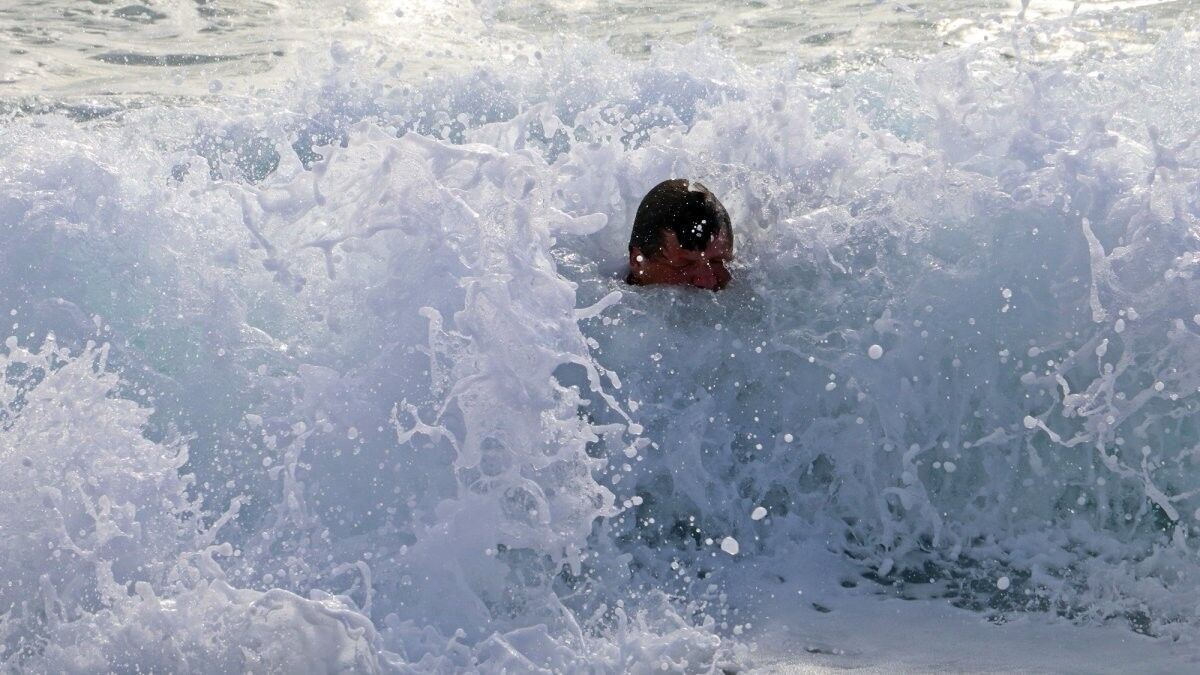 Doyasıya eğlenen turistler, dalgalara karşı direnmeye çalışsa da pek başarılı olamadı.