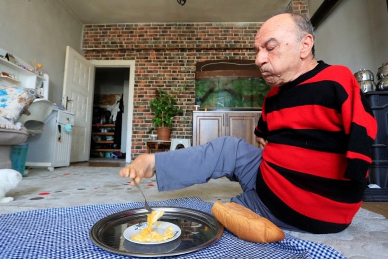 Doğuştan elleri olmayan 69 yaşındaki Mehmet Temel, ayaklarını el gibi kullanarak yaşamını sürdürüyor. Günlük yaşamda birçok işini ayaklarıyla gerçekleştiren Temel, azmiyle örnek oluyor.