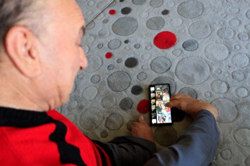 Kaleiçi'ndeki iş yerine geldiğinde ise kepengini açan Temel, takılarını tek tek ayaklarıyla diziyor, cep telefonunu ayaklarıyla kullanıyor ve kahvesini içiyor.