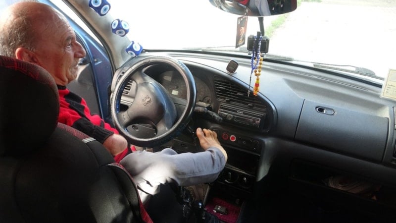 Sürücü koltuğunda özel tertibatlı aracıyla yıllardır araba kullanan Temel, usta şoförleri aratmıyor.