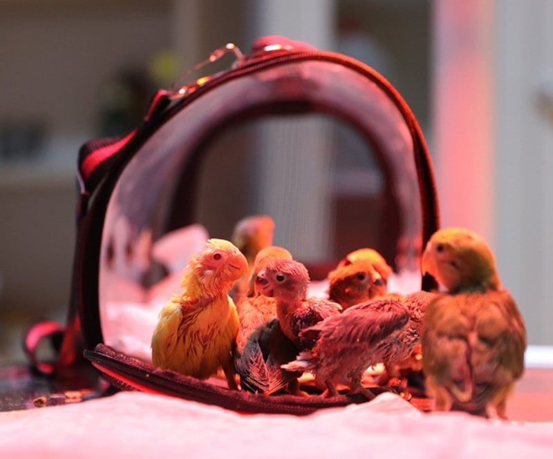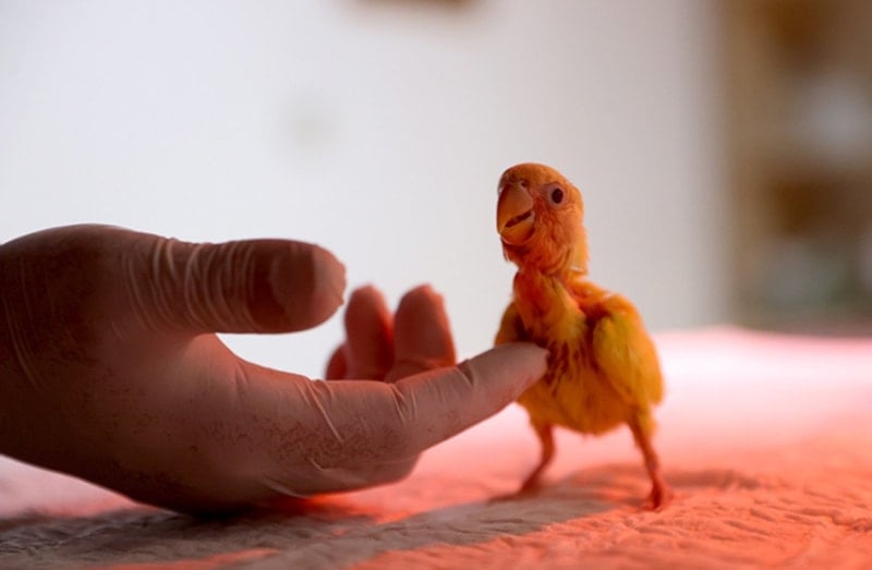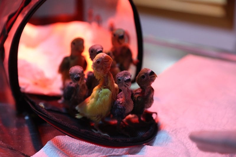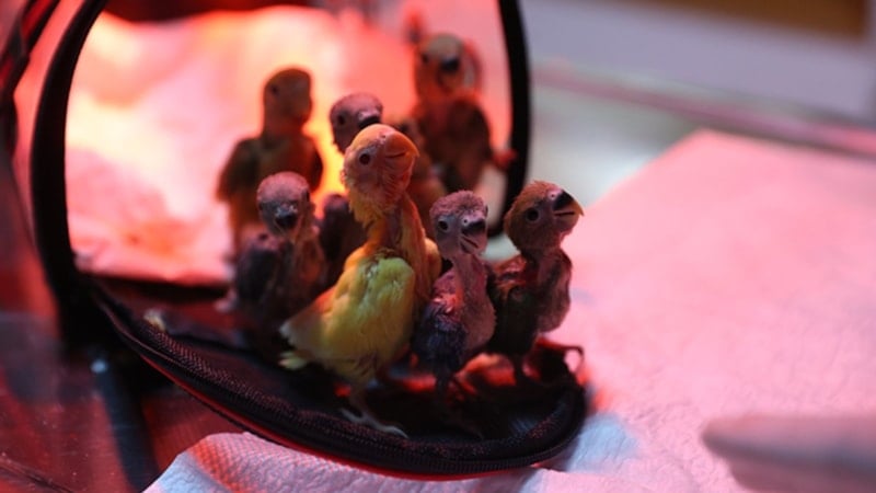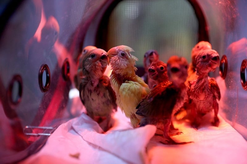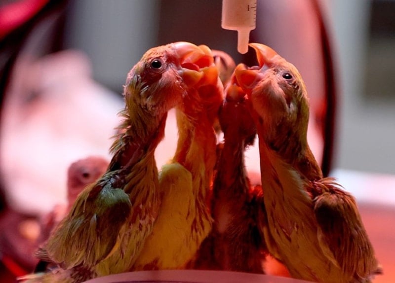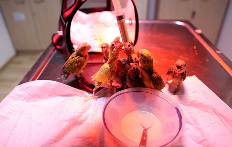 Anne bakımına muhtaç olan 8 yavru cennet papağanı ise özel bakım ünitesinde tutuluyor. Uygun ışık ve oda sıcaklığında muhafaza edilen yavrular, 5 saatte bir şırınga yardımıyla özel mama ile besleniyor.