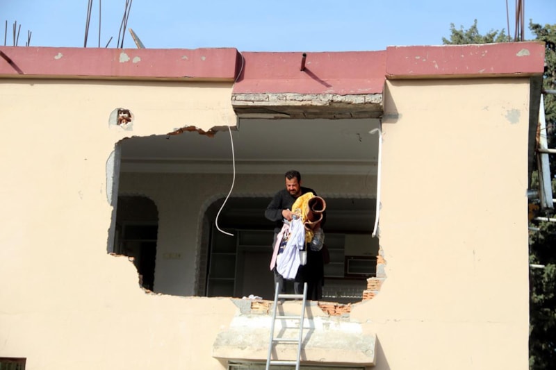 Evli ve 3 çocuk babası 47 yaşındaki Turan Gümüş, tehlikeli olmasına rağmen merdivenle çıktığı evinden sağlam kalan eşyalarını kurtarmaya çalışıyor.