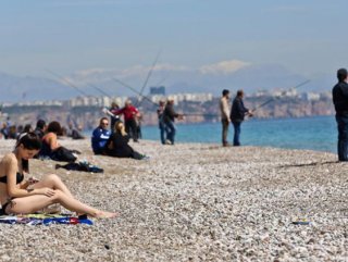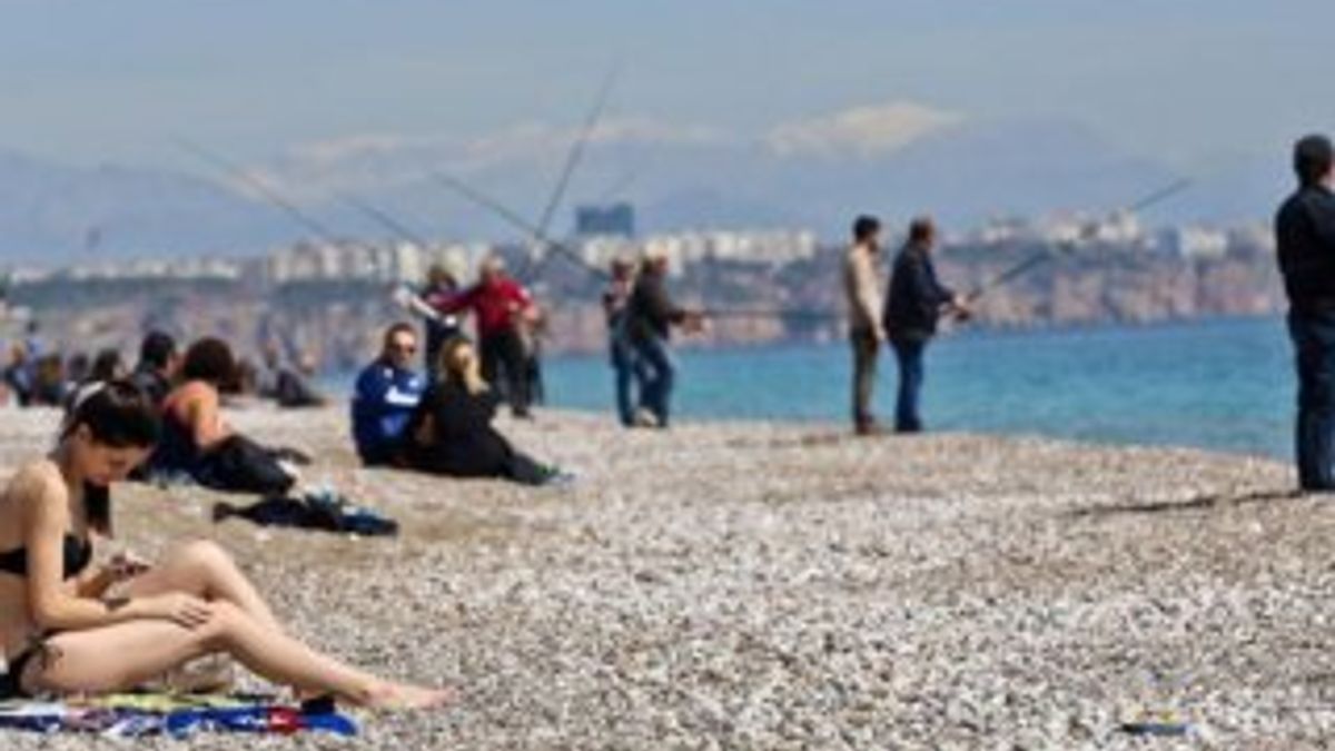 Mart güneşinin tadını çıkaran turistler, denize girmeyi de ihmal etmiyor. Kent sakinleri sabahın ilk ışıklarıyla birlikte dünyaca ünlü Konyaaltı Plajı'na gitti.