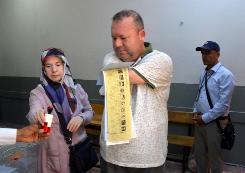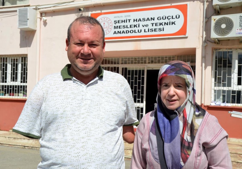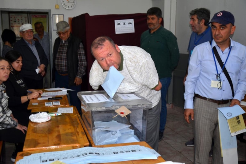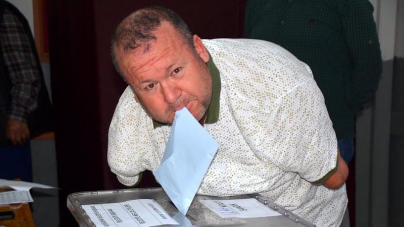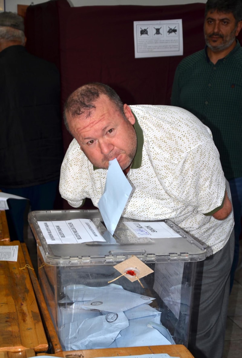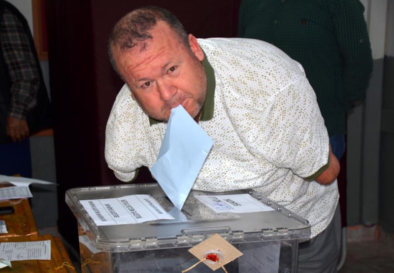 Antalya'nın Serik ilçesinde 32 yıl önce iki kolunu kaybeden 45 yaşındaki Bülent Bodur, oyunu eşinin yardımıyla kullanıp, zarfı ise sandığa kendisi attı.