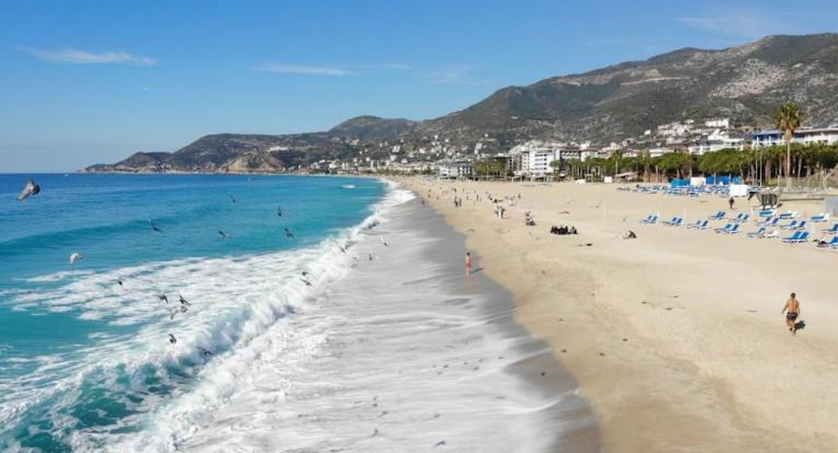 "19 Ocak 2023 tarihinde şu anda 17 derecelik bir sıcağın altındayız. Yüksek kesimlere kar yağdığını görüyoruz fakat güneşli havanın ve denizin tadını yerli ve yabancı vatandaşlar çıkartıyorlar. Güneşli hava olduğu sürece yabancılar sürekli denize akın ediyorlar. Ayrıca deniz bugün dalgalı olmasına rağmen denize girenler var. Havanın sadece güneş açması önemli. Güneş açtıktan sonra herkes buraya akın ediyor. Yerli vatandaşlar da gördüğünüz gibi aileleriyle birlikte güneşli havanın tadını çıkartıyor"