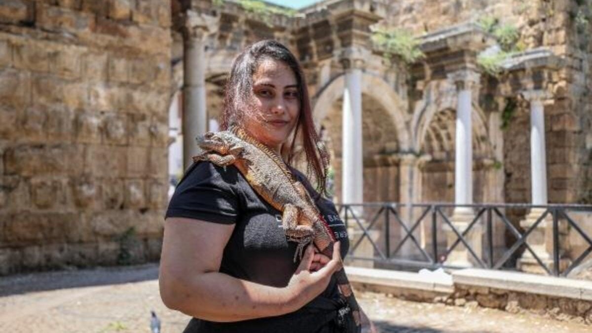 Turizm kenti Antalya'da üç yıl önce sahiplendiği Erago adlı iguanasıyla sokak sokak dolaşan Didem Pınaroğlu, vatandaşların ilgisini çekti.