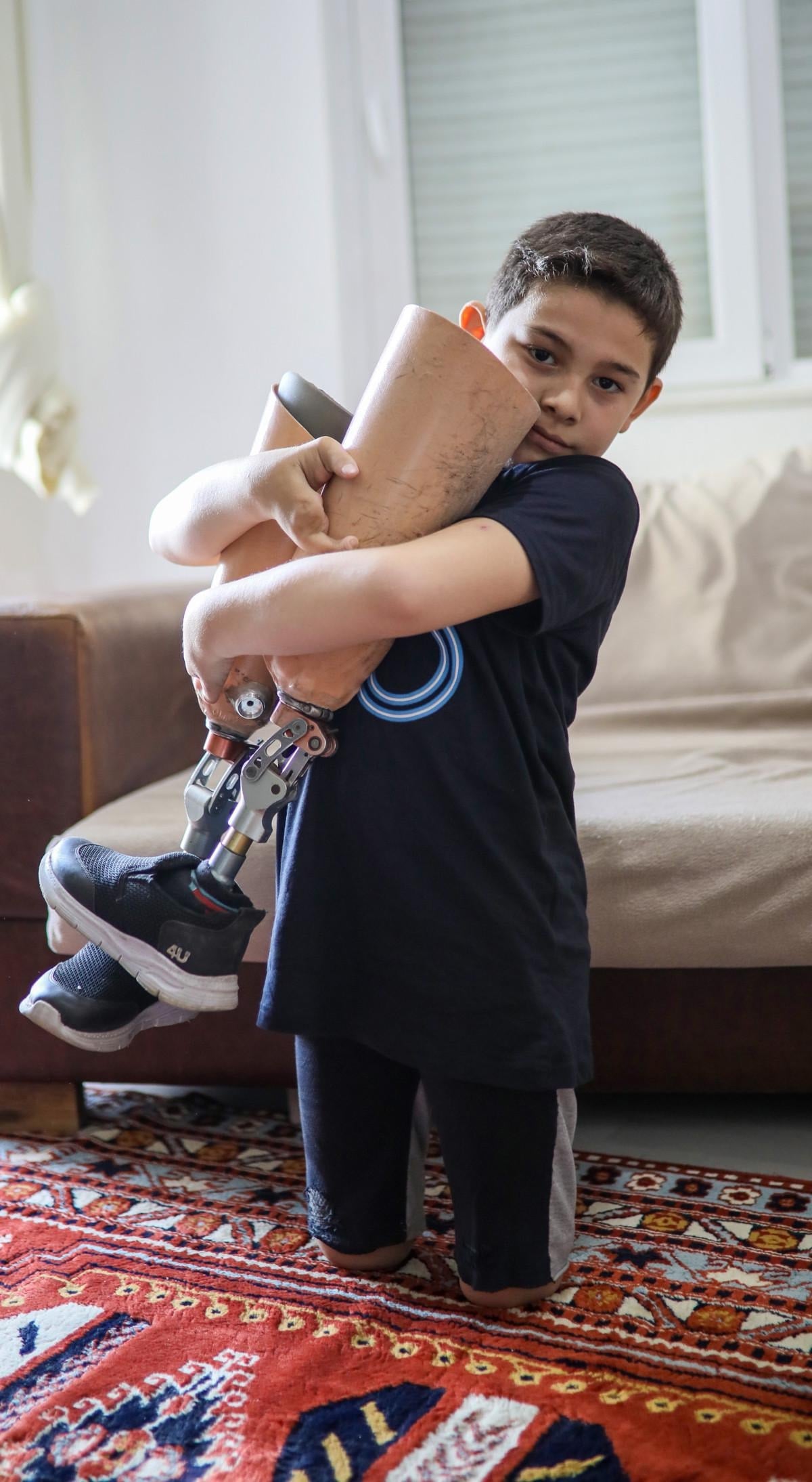 Aras'ın çok neşeli bir çocuk olduğunu belirten Özlem Çelik, "Çok hareketli, çok neşeli, herkesle sohbet ediyor. İlk iki protezlerini yardım toplayarak yaptırdık. Büyümesi devam ettiği için yeniden yaptırmak gerekiyordu.