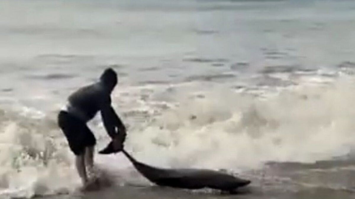 Suyun kenarıhnda kumsalda çırpınan yunusun yaşadığını fark eden Gökgöz ve arkadaşı, kuyruğundan tutarak denize doğru çekti. İki arkadaş, dalgaların tekrar kıyıya sürüklediği yunusu birçok denemelerinden sonra denizle buluşturdu.
