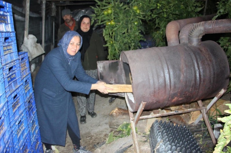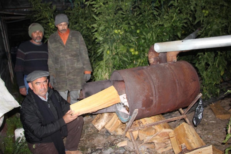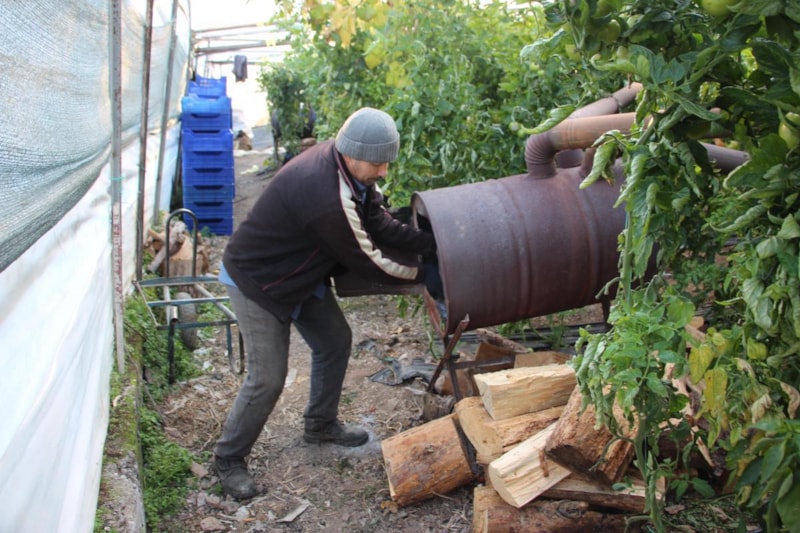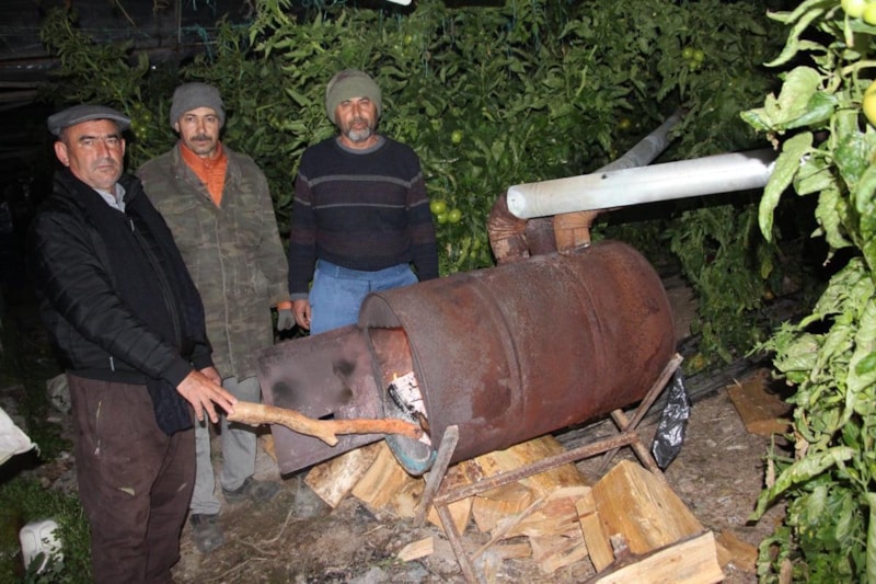 Gündüzleri yakacak odun hazırlayan çiftçiler, güneş batınca havanın soğuması ile serada sobaları yaktı.