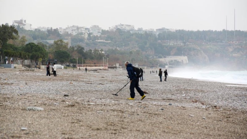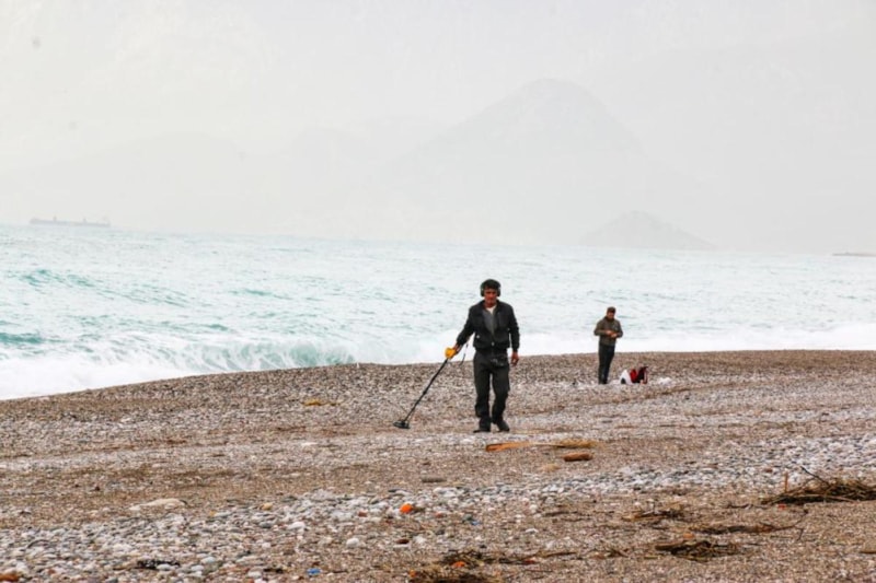 Dünyaca ünlü Konyaaltı Sahili, şiddetli yağış ve fırtınanın ardından turist sakinliğini de fırsat bilerek dedektörle altın ve bozuk para arayan definecilerin adresi oldu.