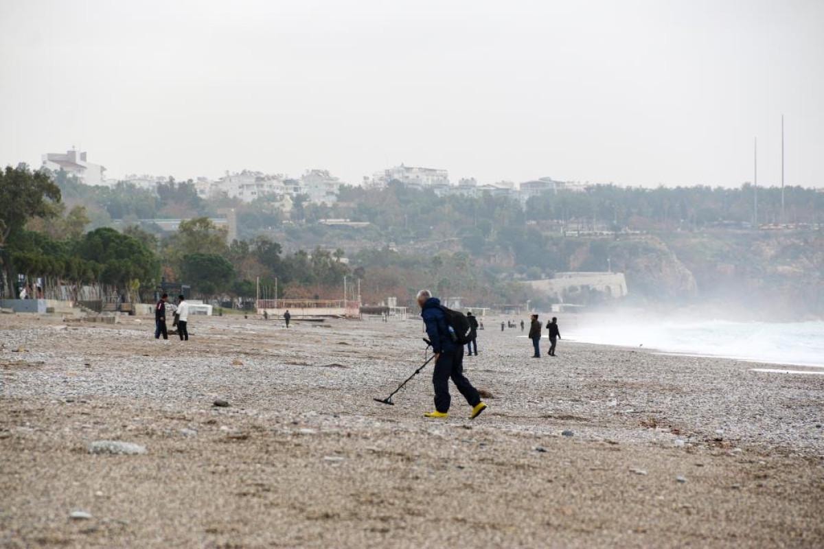 Bazı vatandaşlar, sahilde turistlerin düşürdüğü ziynet eşyası ya da bozuk paraları dedektörle aradı.