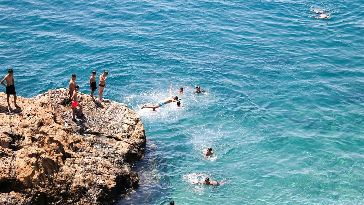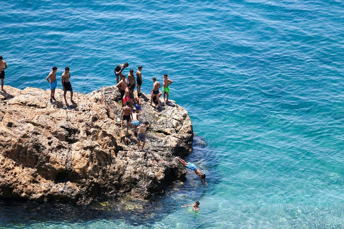 Antalya'da termometrelerin 46 dereceyi gösterdiği sıcaktan bunalanlar soluğu Konyaaltı Sahili'nde aldı.