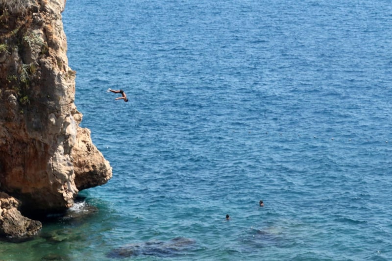 Sahilde renkli görüntüler yaşanırken, tehlikeli anlar da kameraya yansıdı. Bazı vatandaşlar 25 metre yükseklikteki falezlere tırmanarak denize atladı.