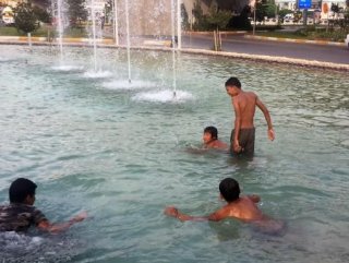 Antalya'da, nem oranının yüzde 62'ye yükselmesiyle sıcaktan bunalan, kağıt toplayıcısı bir grup Suriyeli çocuk, Etiler Mahallesi'ndeki süs havuzuna girerek serinlemeye çalıştı.