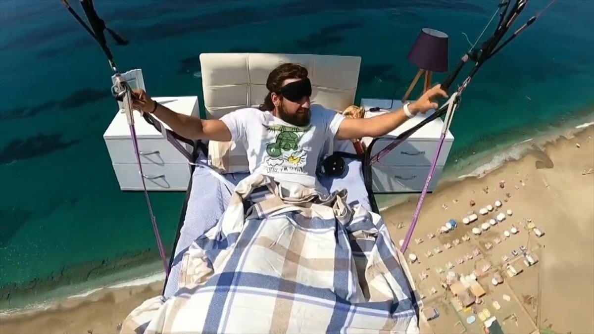 Antalya'nın Alanya ilçesinde yamaç paraşütü pilotu Hasan Kaval, özel olarak hazırlanan düzenekle paraşütüne bağladığı yatağa, yüzlerce metre yüksekte yattı.