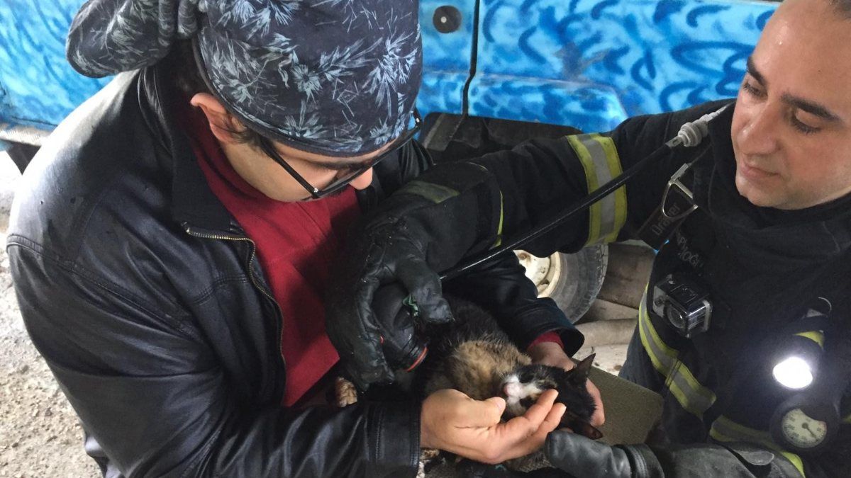 Hareketsiz halde yangın bölgesinden çıkartılan kediye hemen oksijen veren itfaiye ekipleri, kısa süre sonra kedinin hareket etmeye başladığını görünce büyük sevinç yaşadı.