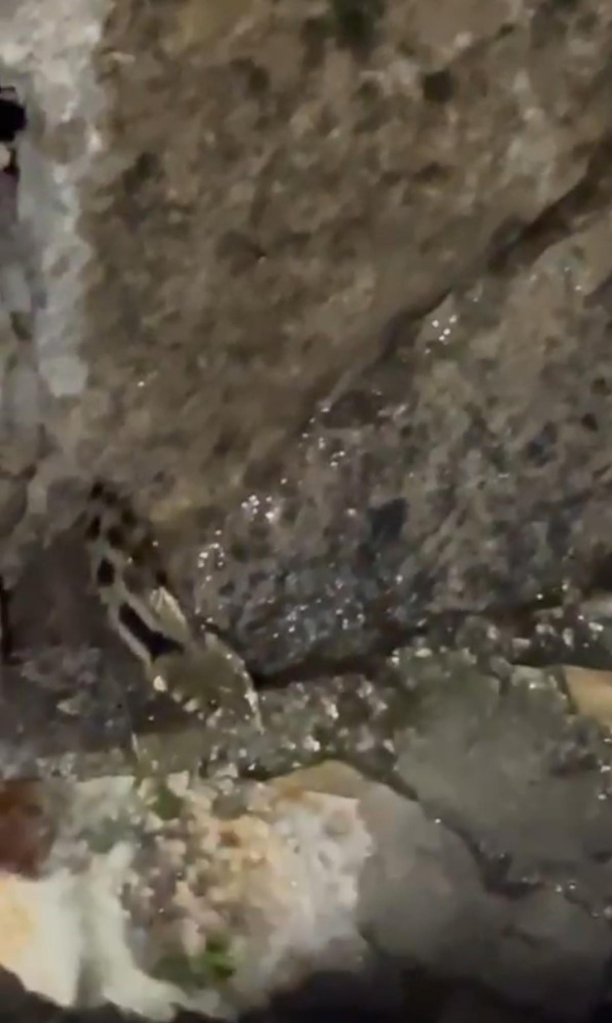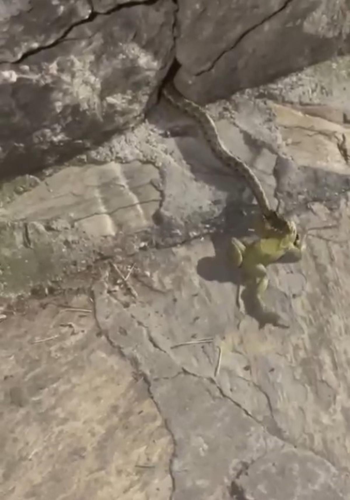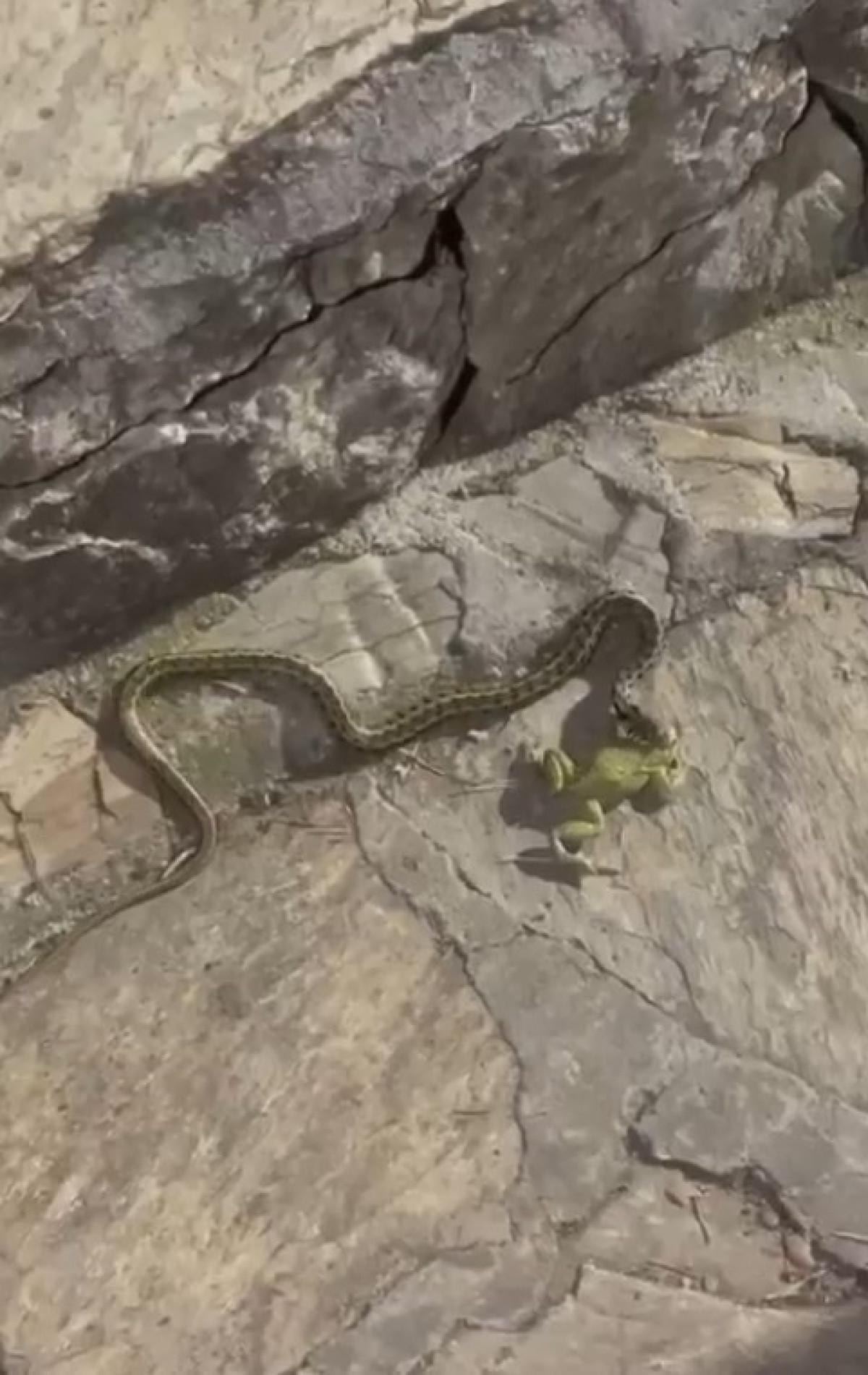 Vatandaşlar, bir yılanın kurbağayı avladığını görünce cep telefonuyla kaydetmeye başladı.