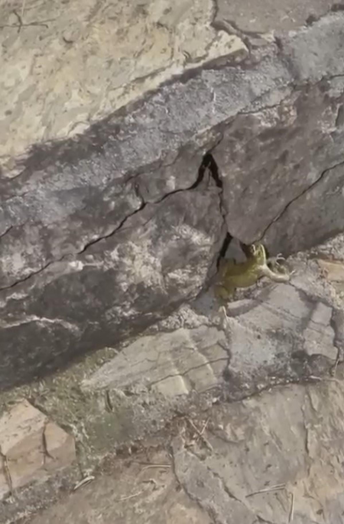 Yılan, ağzıyla yakaladığı kurbağayı yuvasına çekmeye çalışırken, vatandaşlar ise kurbağayı kurtarıp kurtarmama konusunda kendi aralarında ilginç diyaloglara girdi.