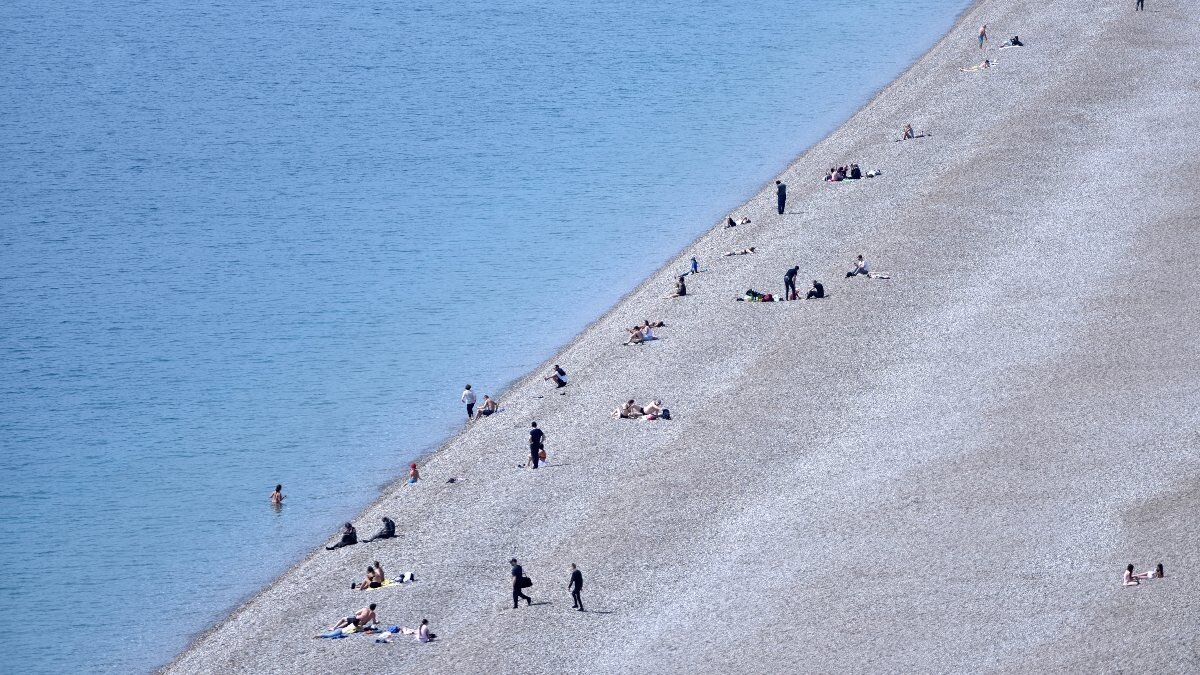 Kısıtlamaya rağmen dünyaca ünlü Konyaaltı Sahili'nde yasaktan muaf olan turistler denize girdi ve sahil bandında yürüyüş yaptı.
