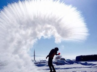Hava sıcaklığının sıfırın altında 10 derec olduğu de Ardahan'ın Göle İlçesi'ne bağlı Arpaşen Köyü'nde güneşin olmasına rağmen dondurucu havada ısıtılan su havaya fırlatıldı.