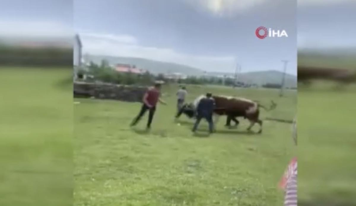 Boğa halatın kopmasıyla çevredeki vatandaşların olduğu yere yöneldi. Ortalık adeta savaş alanına dönerken, boğa önüne geçen bir kişiyi yere yatırdı.