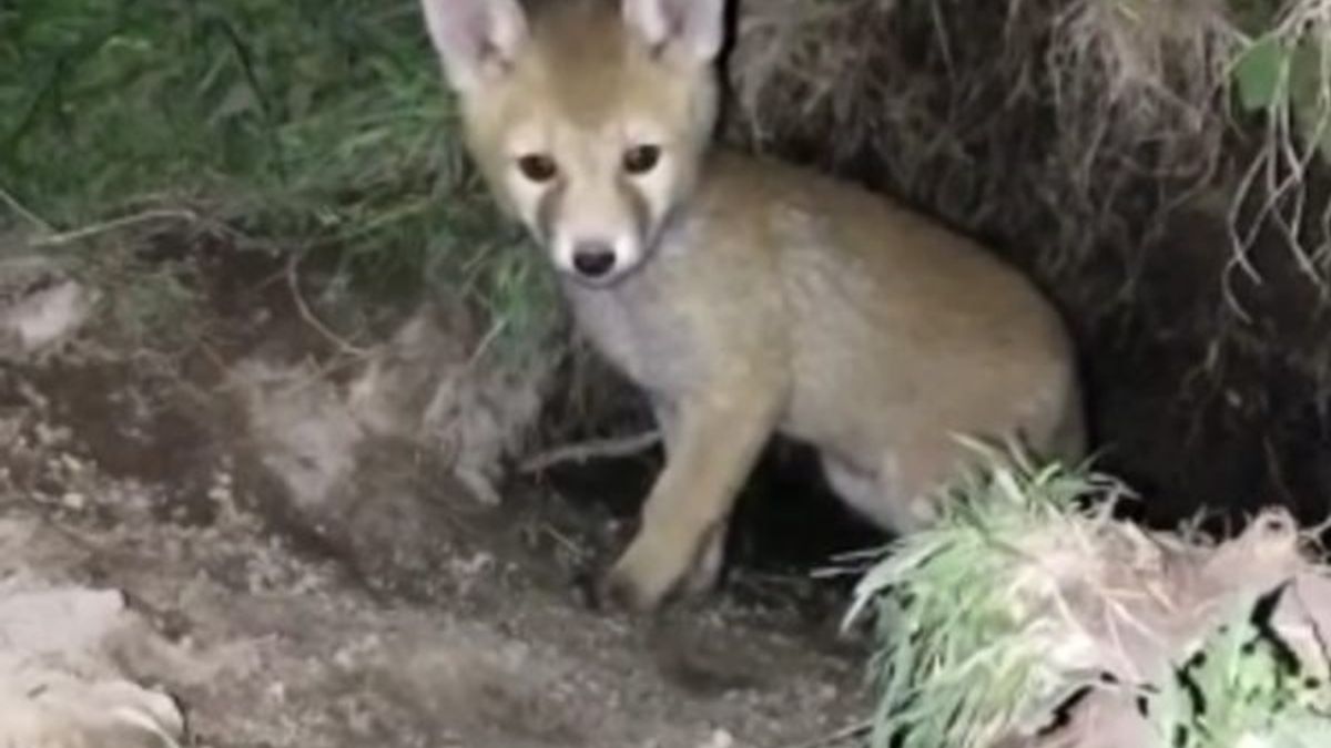 Annesinin yiyecek getirmesini dışarıda, yuvalarının üzerinde bekleyen tilki yavrusu herhangi bir ses duyunca, yuvaya geri girerek saklanıyor.