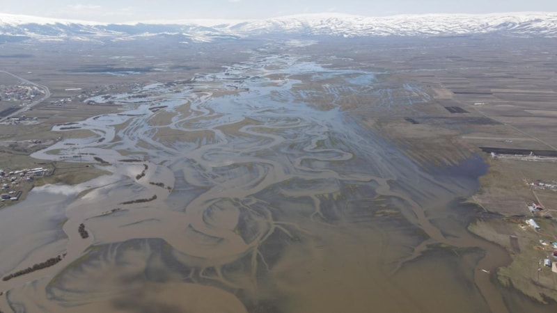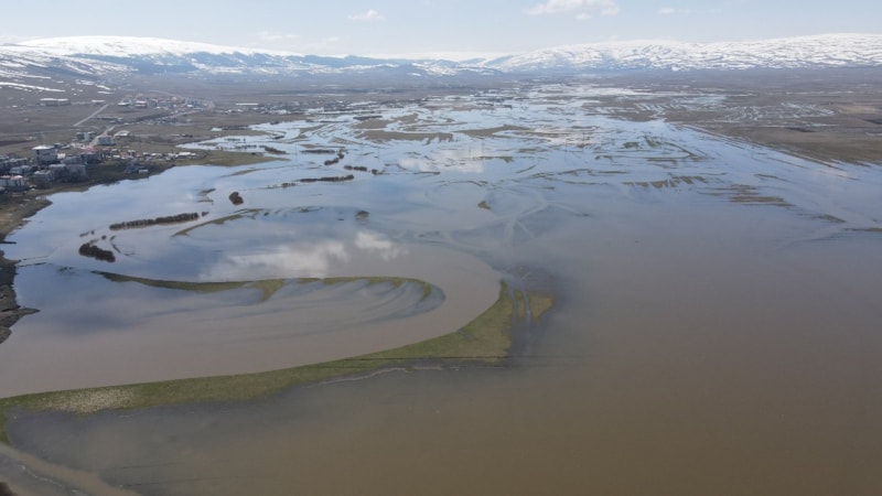 Kura Nehri'nin taşması sonucu etrafındaki meralar sular altında kalırken, göle dönen ova drone ile görüntülendi.