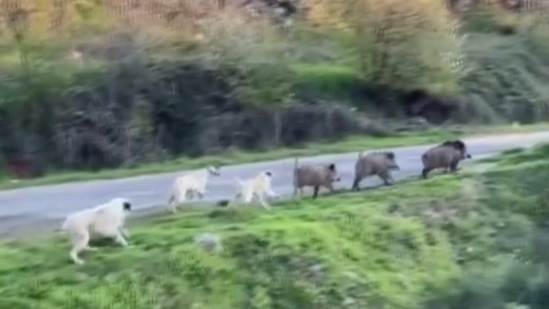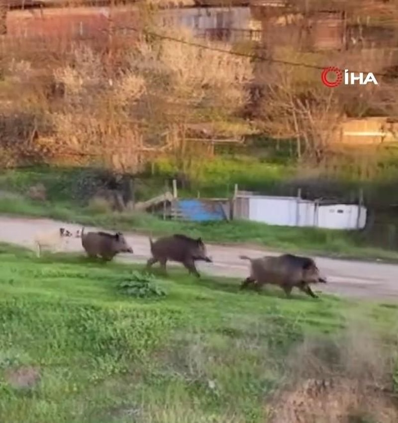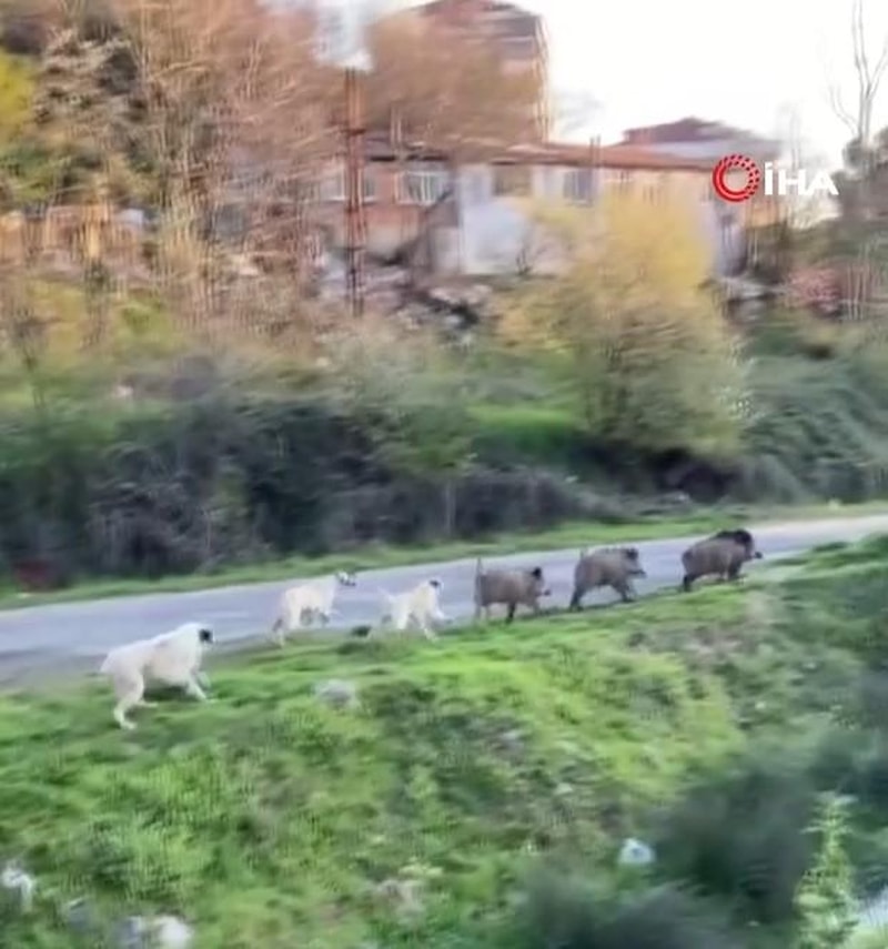 Bir anda toplanan 10'dan fazla sokak köpeği domuzları kovalamaya başladı. Yaşanan kovalamaca yolda yürüyen vatandaşları tedirgin etti.