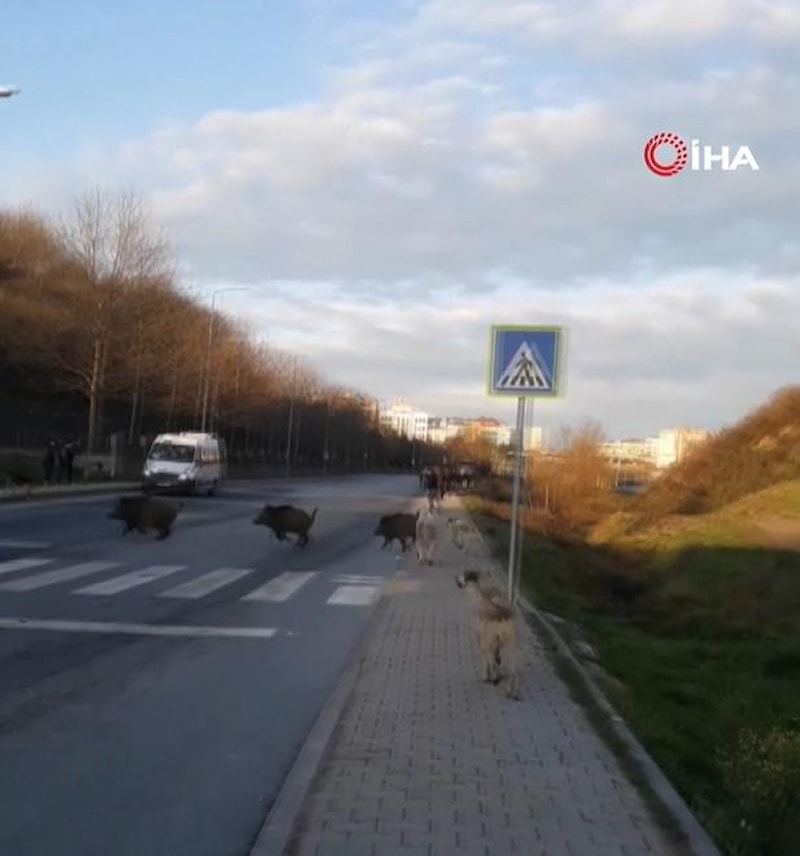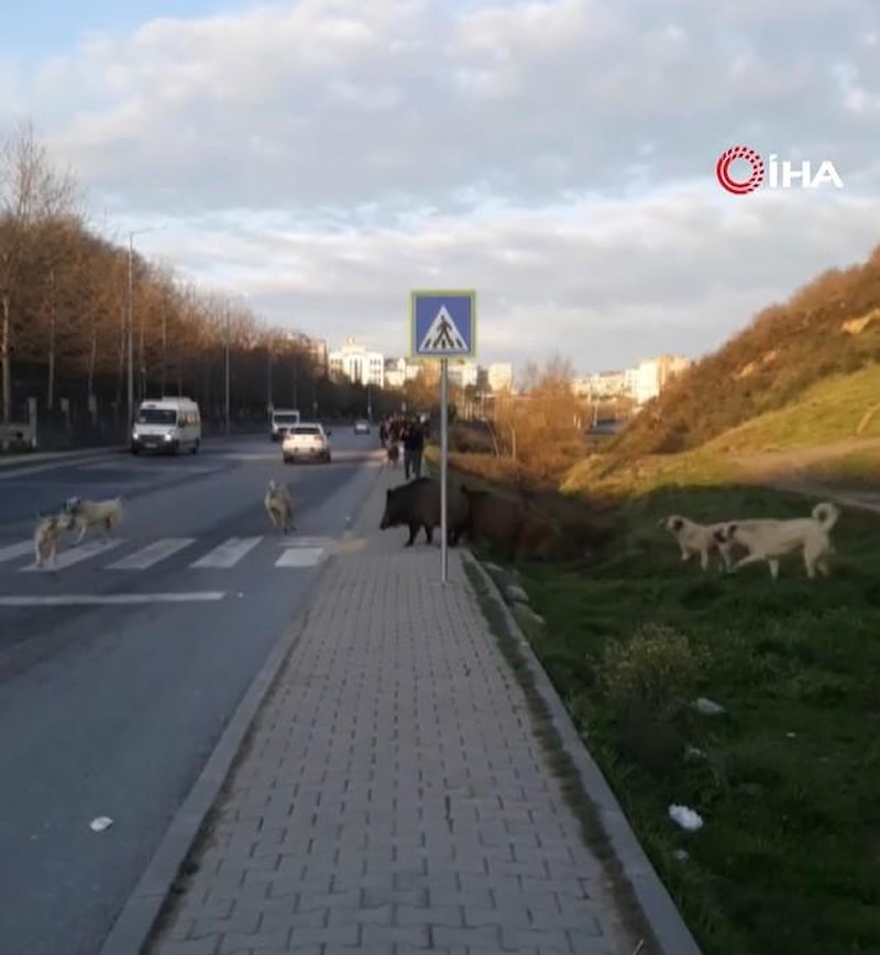 Arnavutköy'de sokak köpeklerinin merkeze inen domuzları vatandaşların arasında kovaladığı anlar kameralara yansıdı.