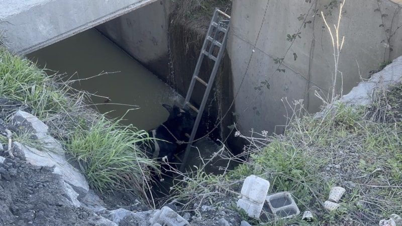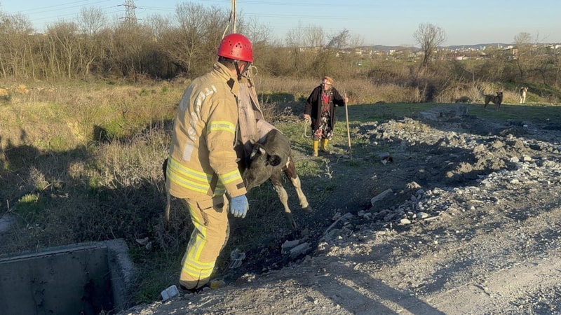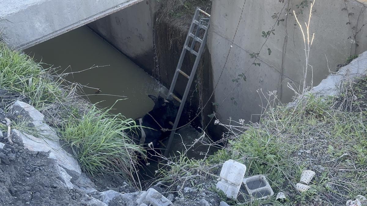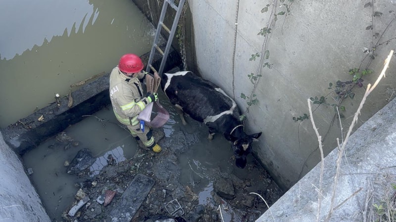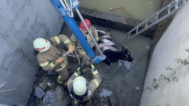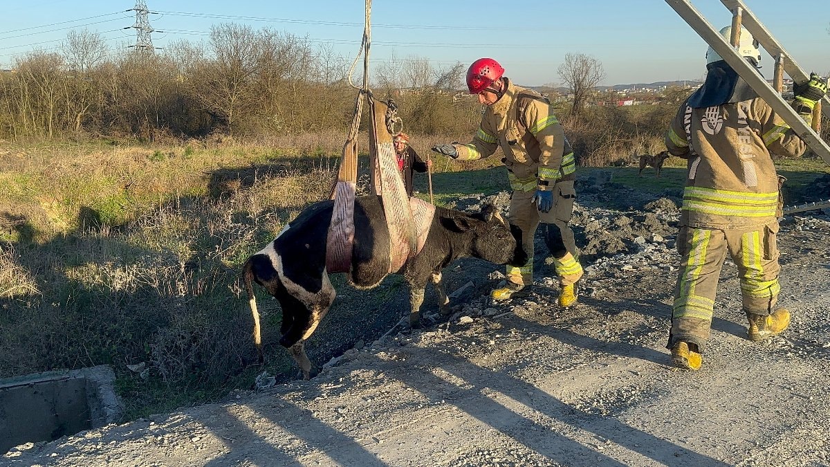 Yaklaşık 3 metre derinlikteki kanala düşen hayvanını kurtarmaya gücü yetmeyen yaşlı kadın itfaiye ekiplerine haber verdi.