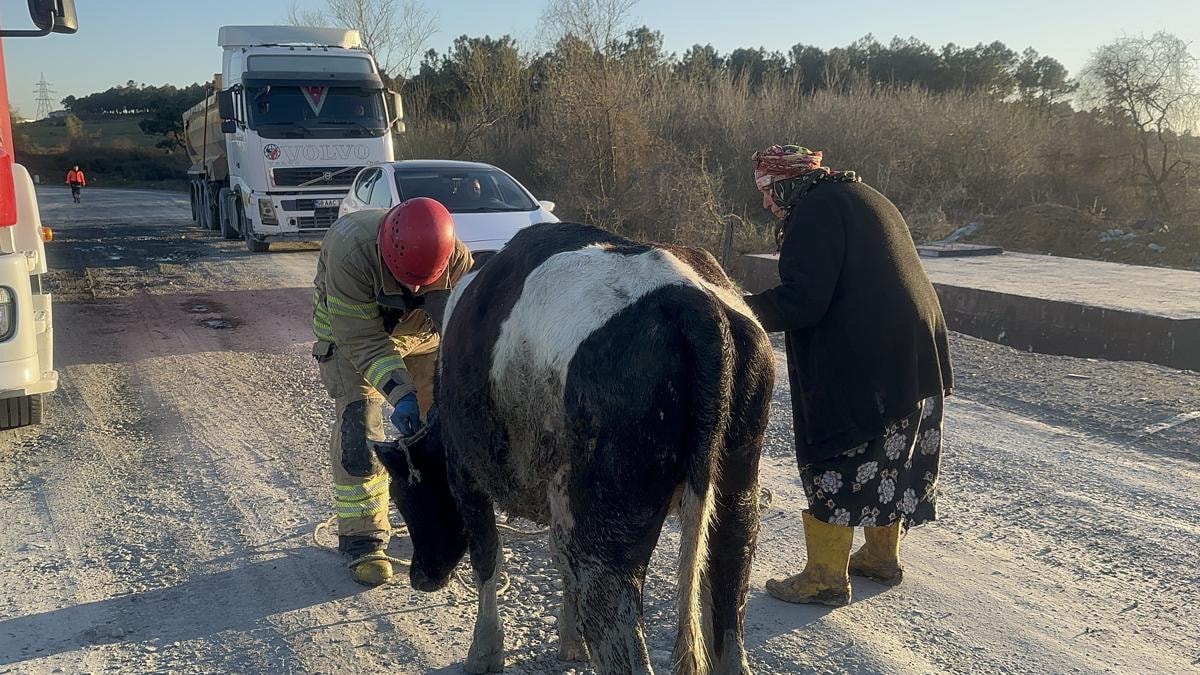 İtfaiye ekipleri kurtardıkları danayı tekrardan zarar görmemesi için yaşlı teyzenin ahırına kadar götürdü.