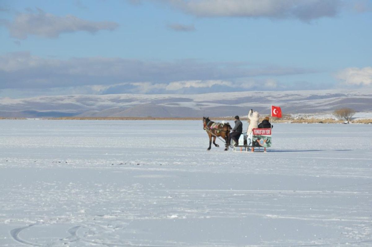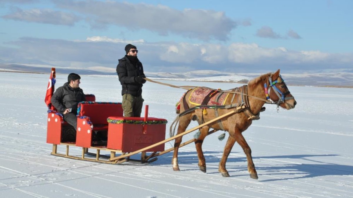 Aslan, "Çıldır gölü buz tuttu. 15-20 santim aralığında buz kalınlığımız var. Atlarımızı çıkardık, atlı kızaklarla gezinti yapıyoruz. Kar motorlarımız, atlı kızaklarımız hepsi gölün üzerinde gelen misafirlerimizi mart ayına kadar ağırlamaya çalışacağız." diye konuştu.