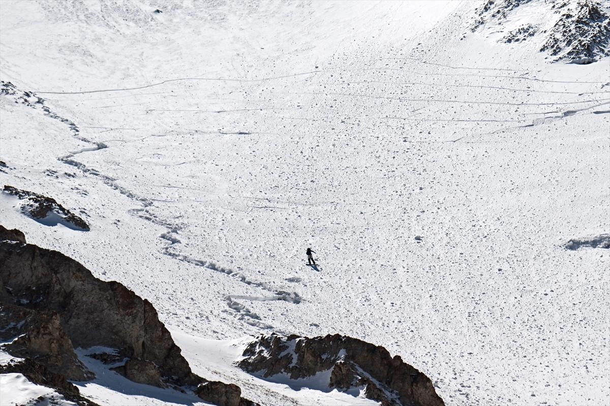 Yaklaşık 4 saat süren zorlu tırmanışla zirveye ulaşan kayakçılar, bir süre mola verdikten sonra yüksek eğimli bölgeden snowboard ile slalom yaparak inmeye başladı.