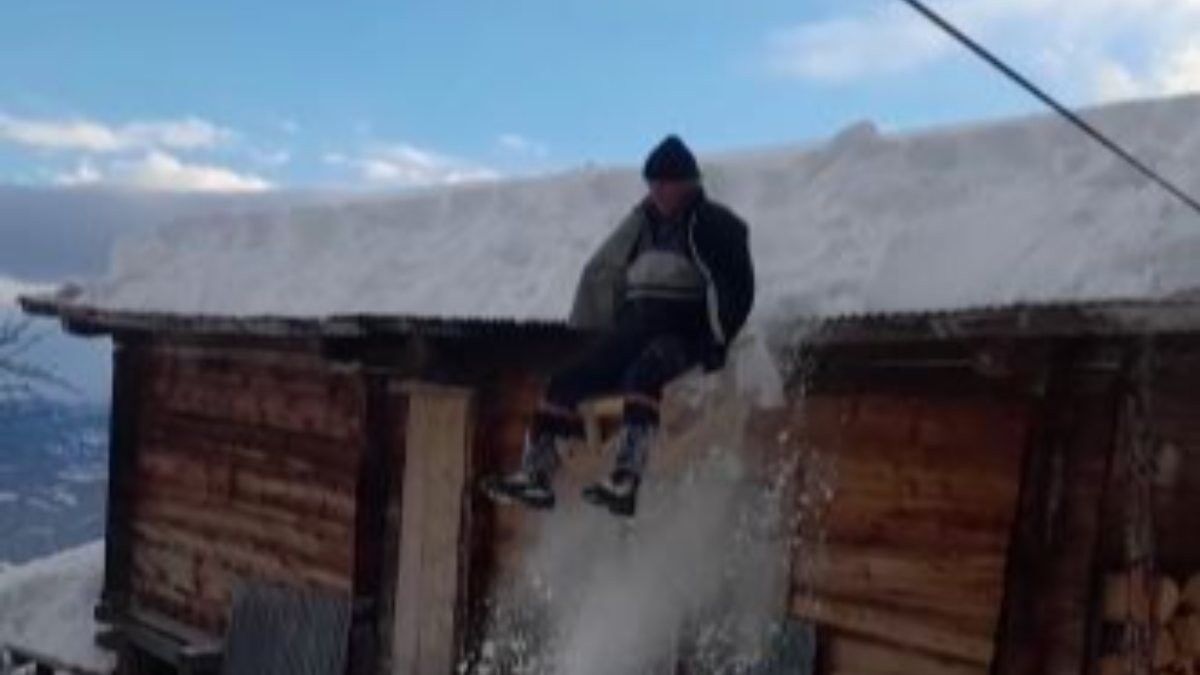 Tahta kızaklarını alan dede ve torunu, yolda kaymak yerine evin çatısına çıkarak eğlenmeyi tercih etti.