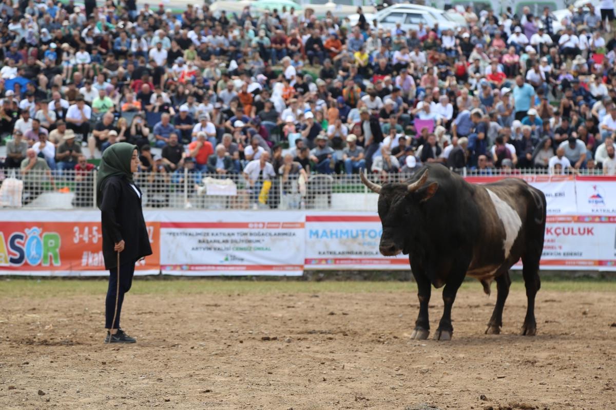 Festival alanında binlerce kişinin katılımıyla gerçekleşen etkinlikte, kadın boğacı Nezafet Sılacı, ‘Tori’ isimli 590 kilogramlık boğasıyla arenaya çıktı.