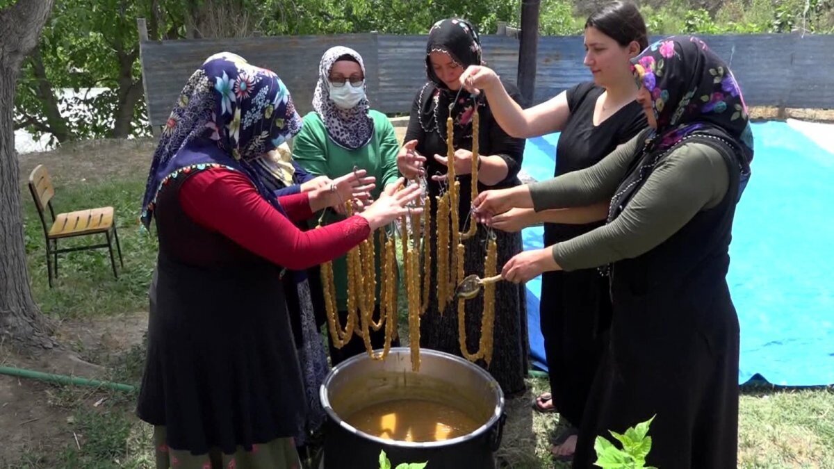Kuruyan hamur karışımı, pestil olarak tüketiliyor. Bir yandan da köme yapan kadınlar, cevizleri iplere sırayla diziyor.